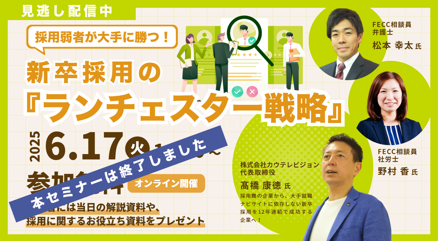 「新卒採用に苦戦している」「さまざまな採用ツールを試しているが効果が出ない」「ようやく採用できた人材が早期に離職してしまう」といった、新卒採用や人材育成に関するお悩みを抱えている企業様は多いのではないでしょうか。労働人口の減少が続くなか、人材の確保と育成はすべての企業に共通する課題となっており、特にスタートアップ企業や中小企業においては、厳しい状況に直面しているケースも見受けられます。本セミナーでは、 中小企業1000社以上の採用/インターン支援実績を持ち、自社でも大手就職ナビサイトに依存せず、12年連続で新卒2〜7名の採用を実現 している株式会社カウテレビジョン 代表取締役 高橋康徳様を講師にお迎えし、今、企業に求められている 「採用ランチェスター戦略」 についてご講演いただきます。また、セミナー後半では、インターンシップ期間中や内定時における留意点など、採用活動においてトラブルを防ぐために知っておきたい労務・法律の基礎知識を、ベンチャー企業やスタートアップ企業への支援実績が豊富な弁護士および社会保険労務士が分かりやすく解説いたします。